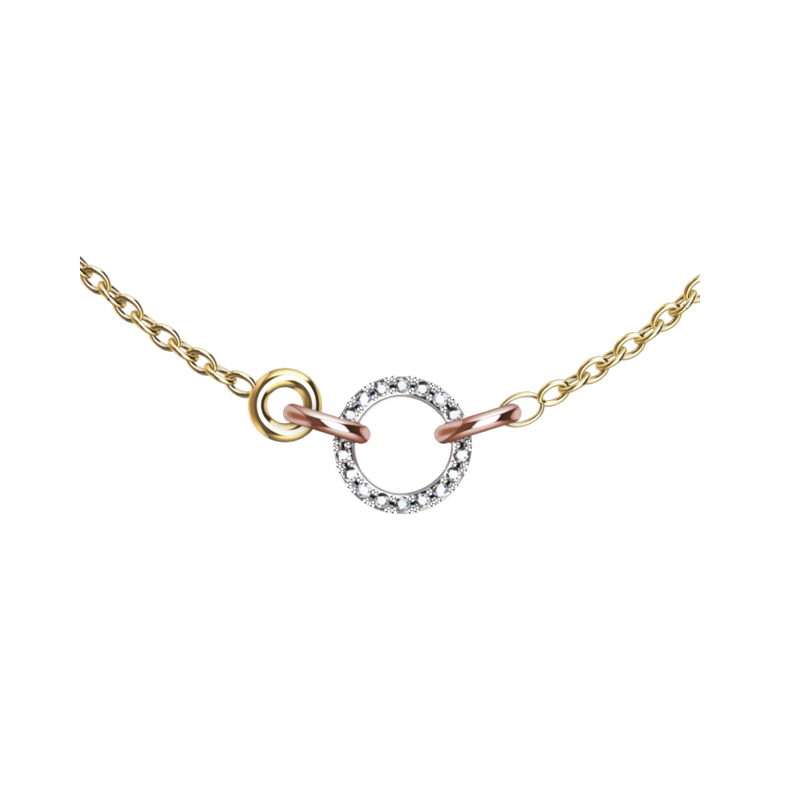 Ha uno stile iconico, caratterizzato da una catena in Oro alla quale sono collegati due piccoli anellini, uno in Oro bianco ricoperto di brillanti e uno in Oro rosa che abbracciano un anellino d’Oro più grande.