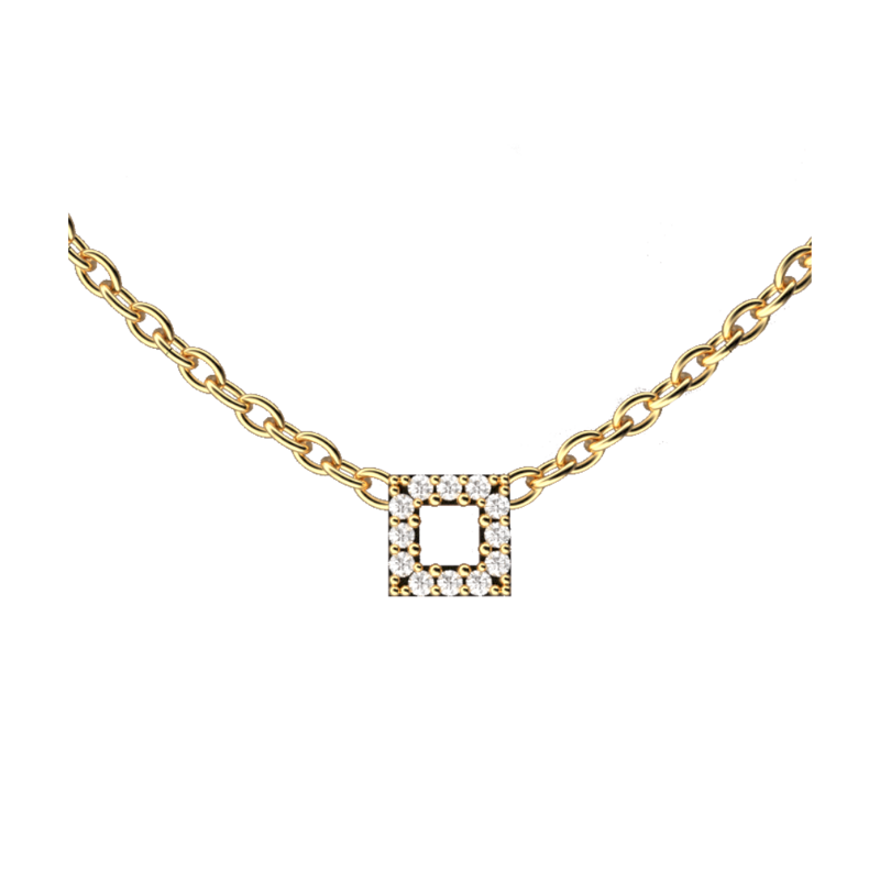 Il girocollo della collezione Square è formato da una catenina alla quale è saldato un prezioso quadratino, impreziosito da 12 Brillanti naturali incastonati lungo tutta la superficie. Realizzato in Oro giallo 18 carati.