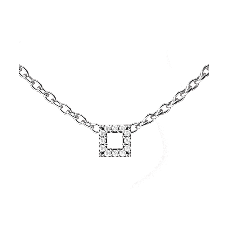 Il girocollo della collezione Square è formato da una catenina alla quale è saldato un prezioso quadratino, impreziosito da 12 Brillanti naturali incastonati lungo tutta la superficie. Realizzato in Oro bianco 18 carati.